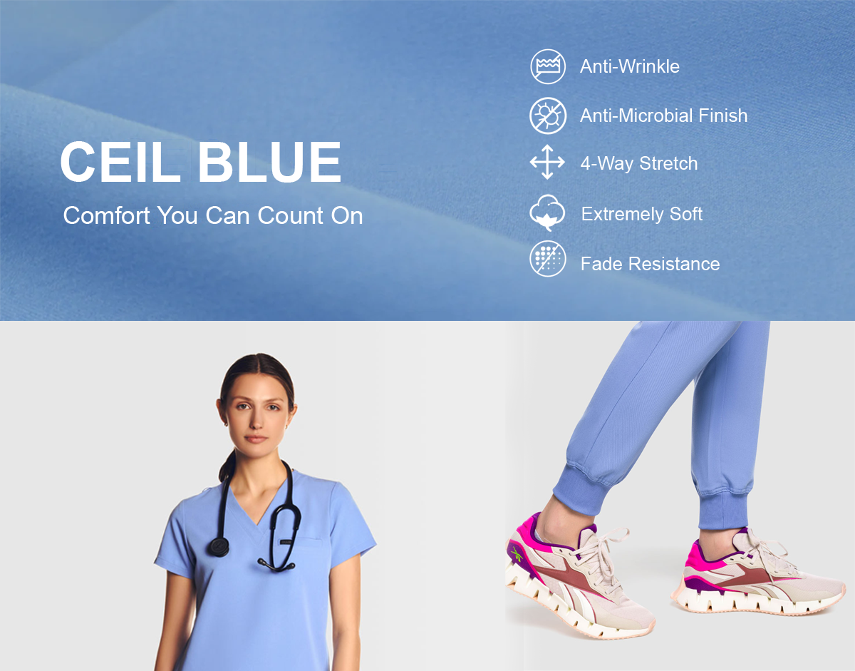Easure scrubs designs with attention to fabric quality and wear life. The Ceil Blue shade holds its appearance after regular washing, and the soft, stretchable material allows ease of movement throughout long work hours.