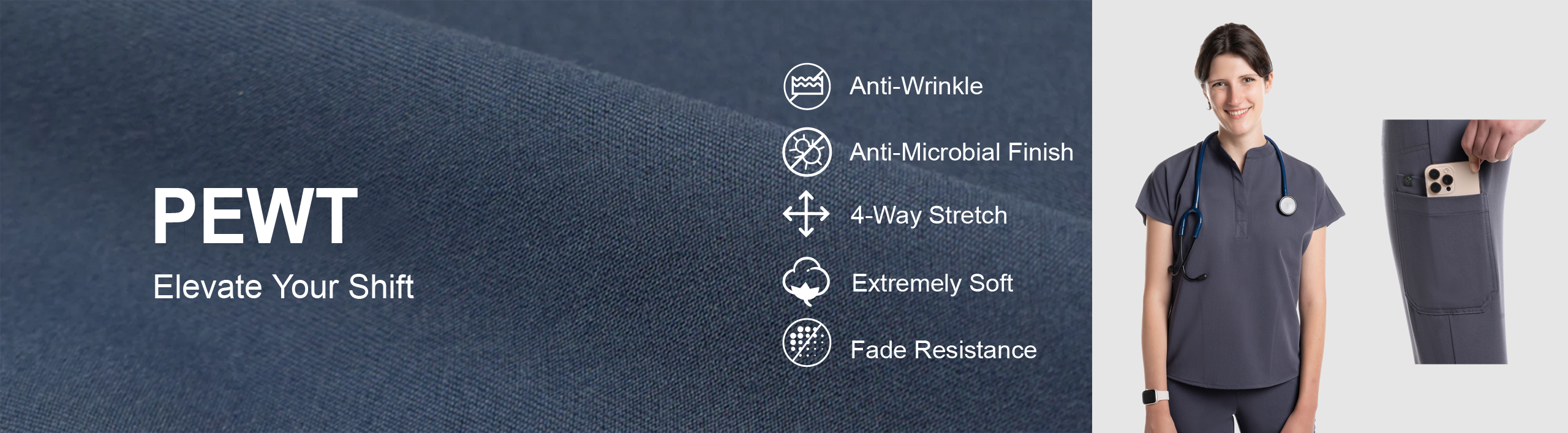 We have a name in the USA healthcare. Our scrubs have antimicrobial protection, anti-wrinkle, extreme softness, and 4-way stretch, and the color does not fade, which is why they will be a good fit for the US healthcare professionals.