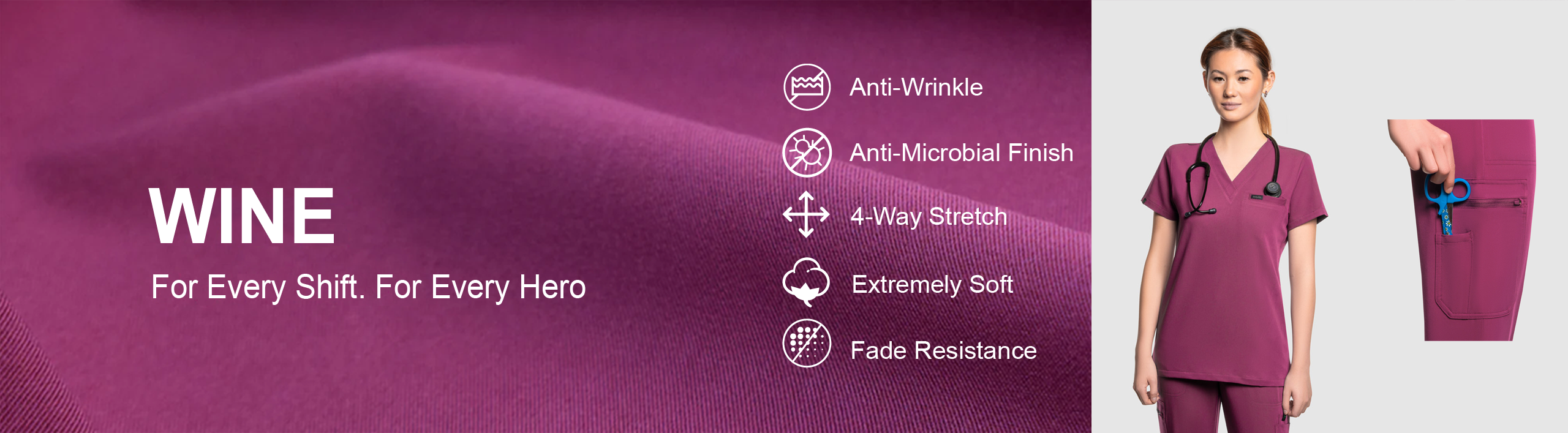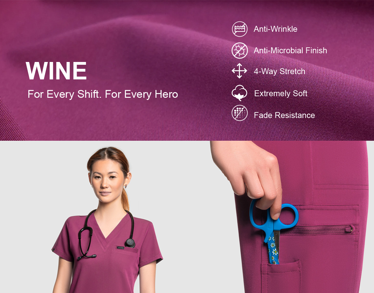 Easure Scrubs focuses on long-lasting fabric and practical design. The deep Wine color stays sharp after repeated washing, while the soft material and flexible stretch help support movement during long and busy shifts.