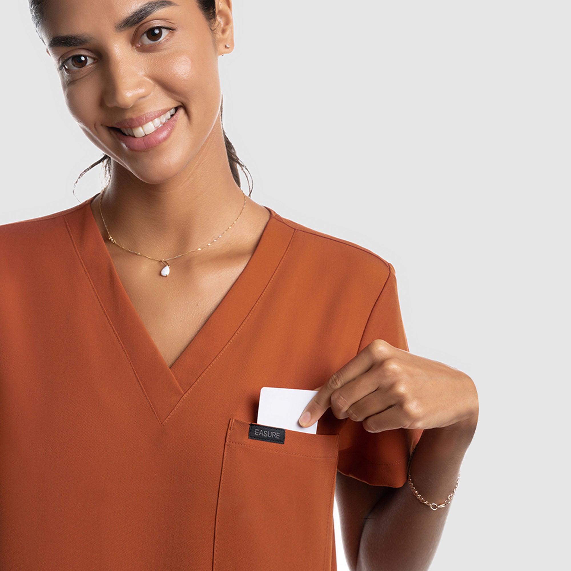Experience the ultimate convenience with our One pocket scrubs top. A handy basic chest pocket gives you quick access to essentials like pens, IDs, or stethoscopes. And, of course, the scrubs top also has the classic V-neck and side-sit hems.