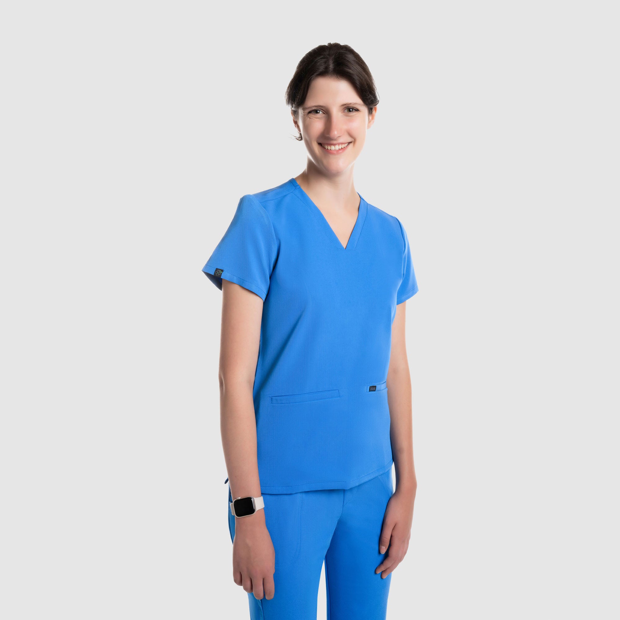 Experience the ultimate convenience with our two pocket scrub top. A handy two front drop pockets offer ample space for essentials like your phone, pens, IDs, or stethoscopes, or other everyday items. And, of course, the scrubs top also has the classic V-neck and side-sit hems.